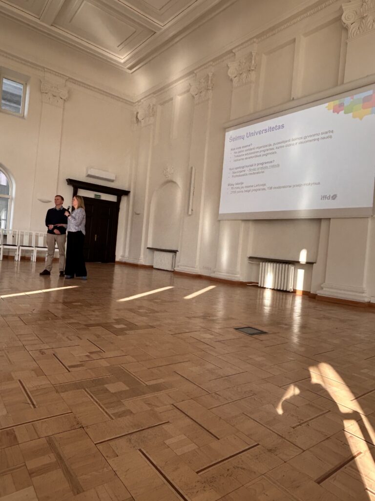 Šeimų universitetas, kilęs iš Ispanijos, kviečia poras mąstyti kartu – per atvejo analizę, diskusiją, pasidalinimą. Grupės suskirstytos pagal vaikų amžių, o esmė ta, kad pora auga ne tik klausydama, bet ir kalbėdama – tarpusavyje ir su kitomis šeimomis.